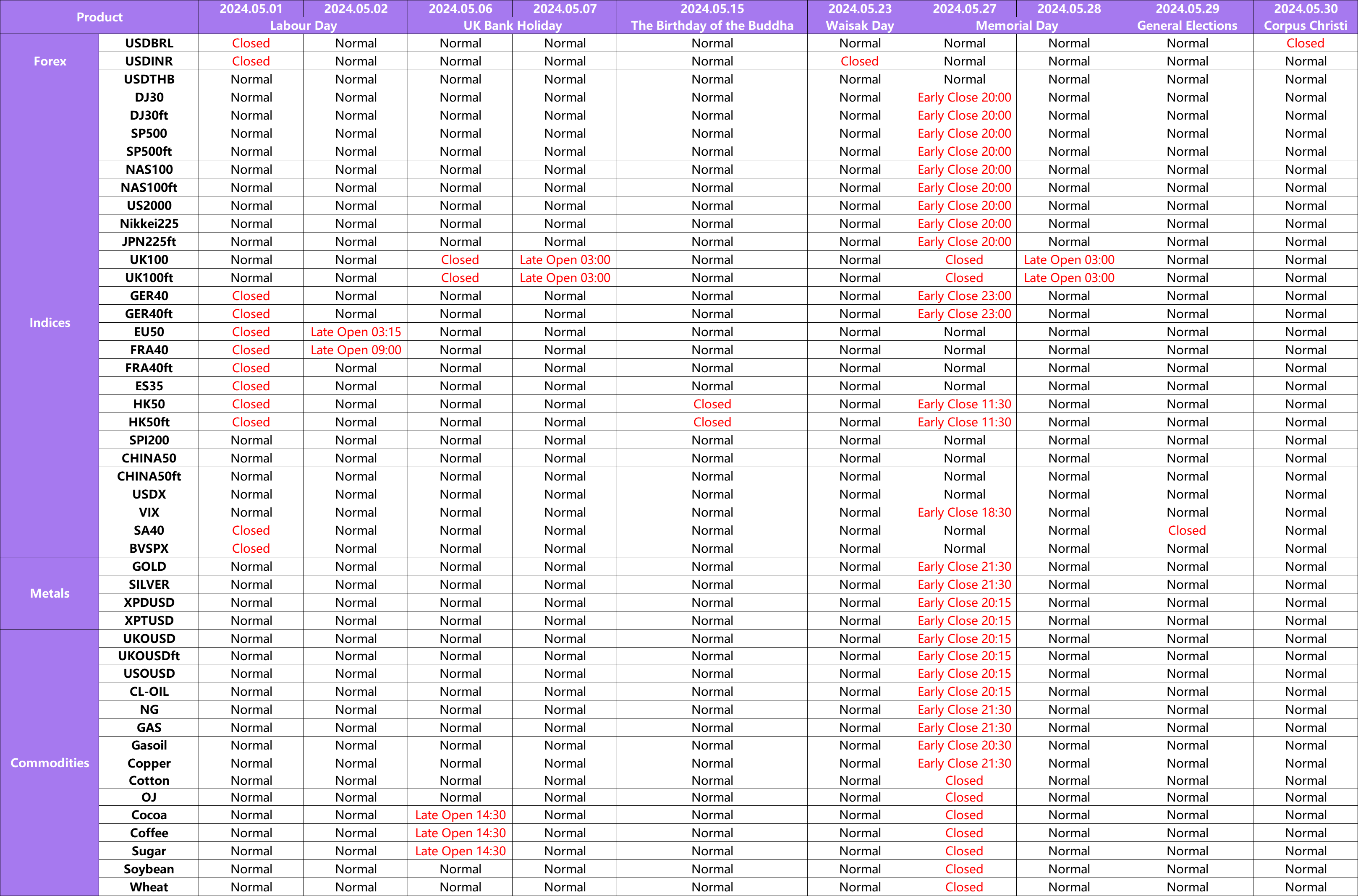 Please be advised that the following instruments’ trading hours will be affected by the upcoming May Holidays.