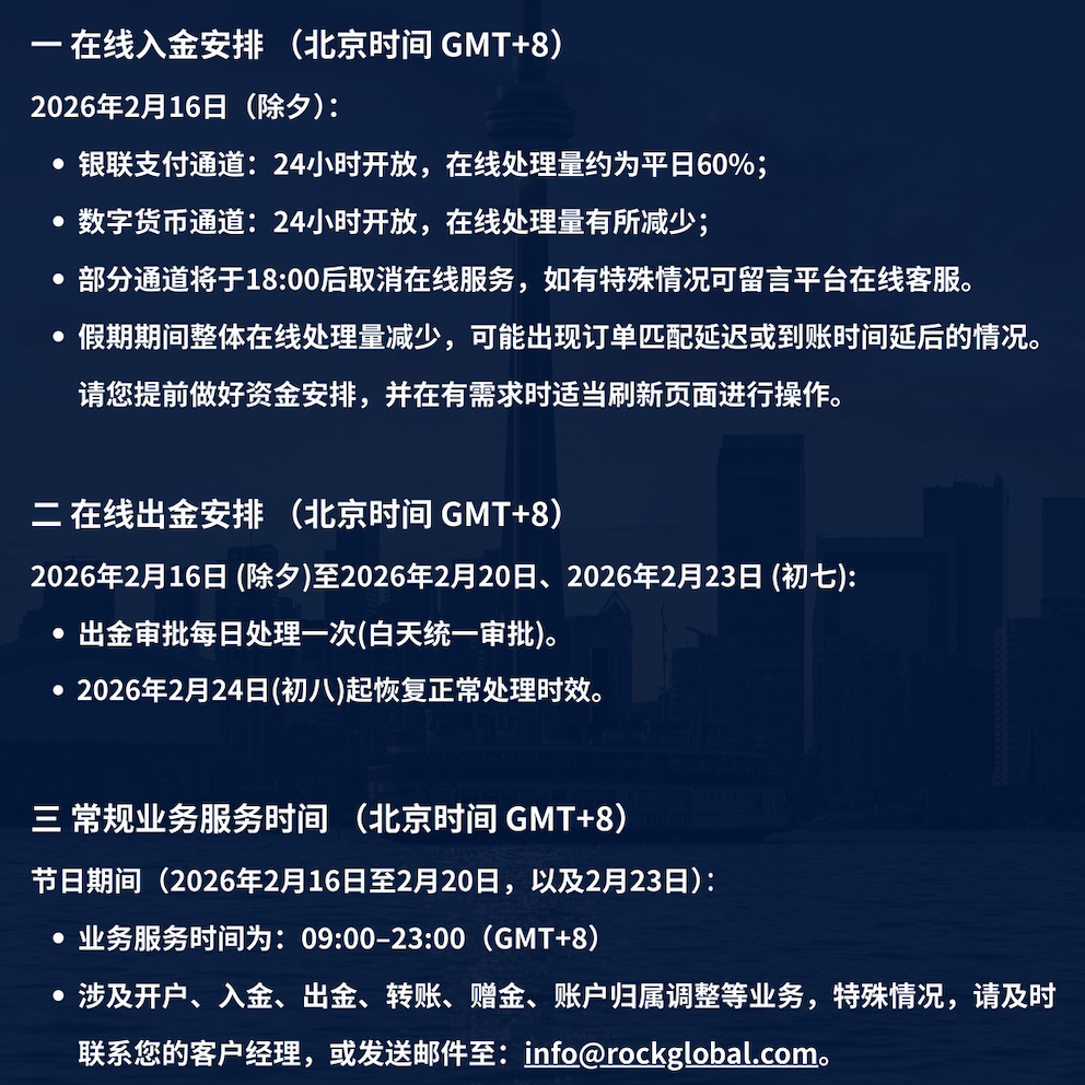 根据2026年中国春节假期安排,北京时间2026年02月15日(周日)至2026年02月23日(周一)(GMT+8)为春节假期。受此影响,我司在线业务时间将作出相应调整,具体安排如下:
